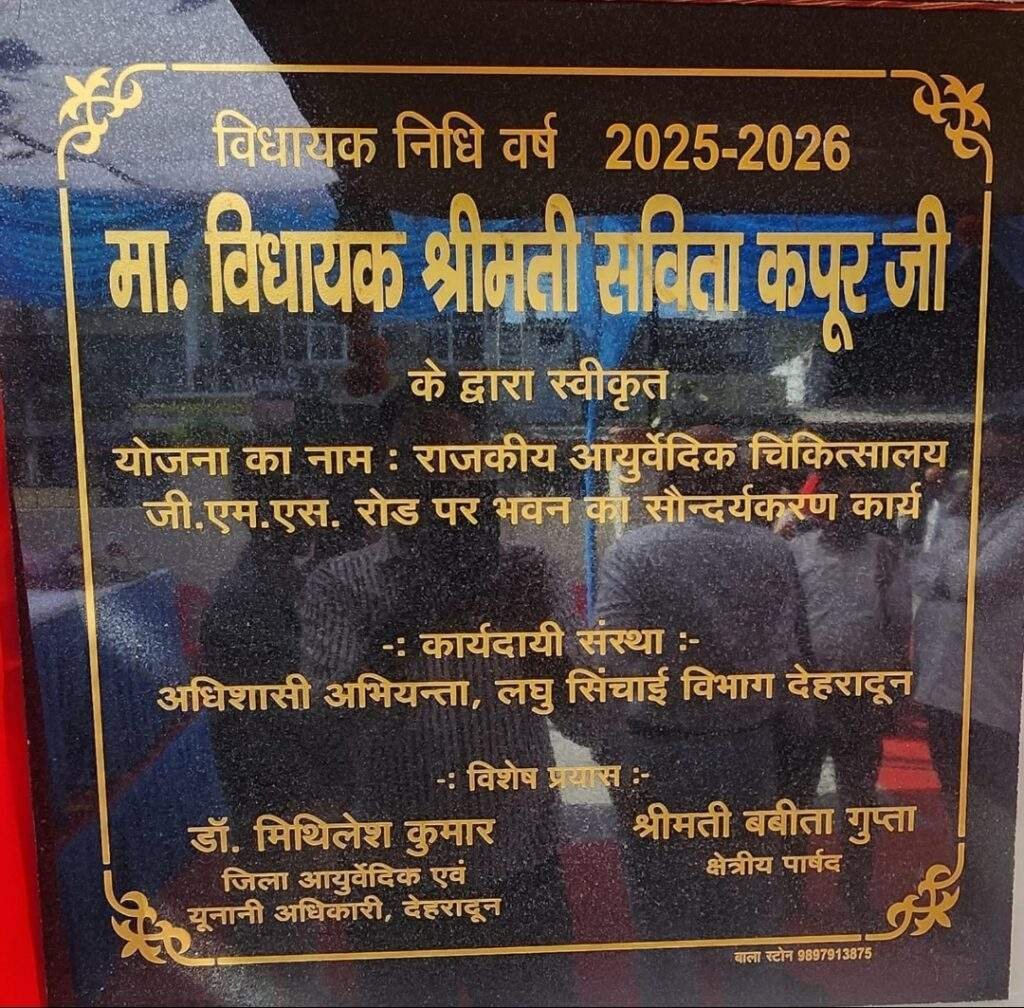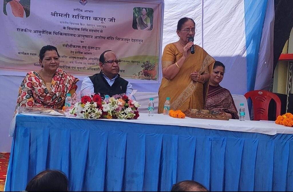 विधायक कैंट श्रीमती सविता कपूर ने बृहस्पतिवार को आयुष्मान आरोग्य मंदिर (आयुष), राजकीय आयुर्वेदिक चिकित्सालय, निरंजनपुर के सौंदर्यकृत भवन का उद्घाटन किया गया। इस अवसर पर विधायक ने कहा कि सरकार आमजन को बेहतर स्वास्थ्य सुविधाएँ उपलब्ध कराने के लिए निरंतर प्रयासरत है। इस मौके पर जिला आयुर्वेदिक एवं यूनानी अधिकारी ने मा0 विधायक को पंचायत भवन में संचालित चिकित्सालय भवन को आयुष विभाग को हस्तांतरित करने का प्रस्ताव भी रखा। इस पर विधायक ने पूर्ण आश्वासन दिया गया।