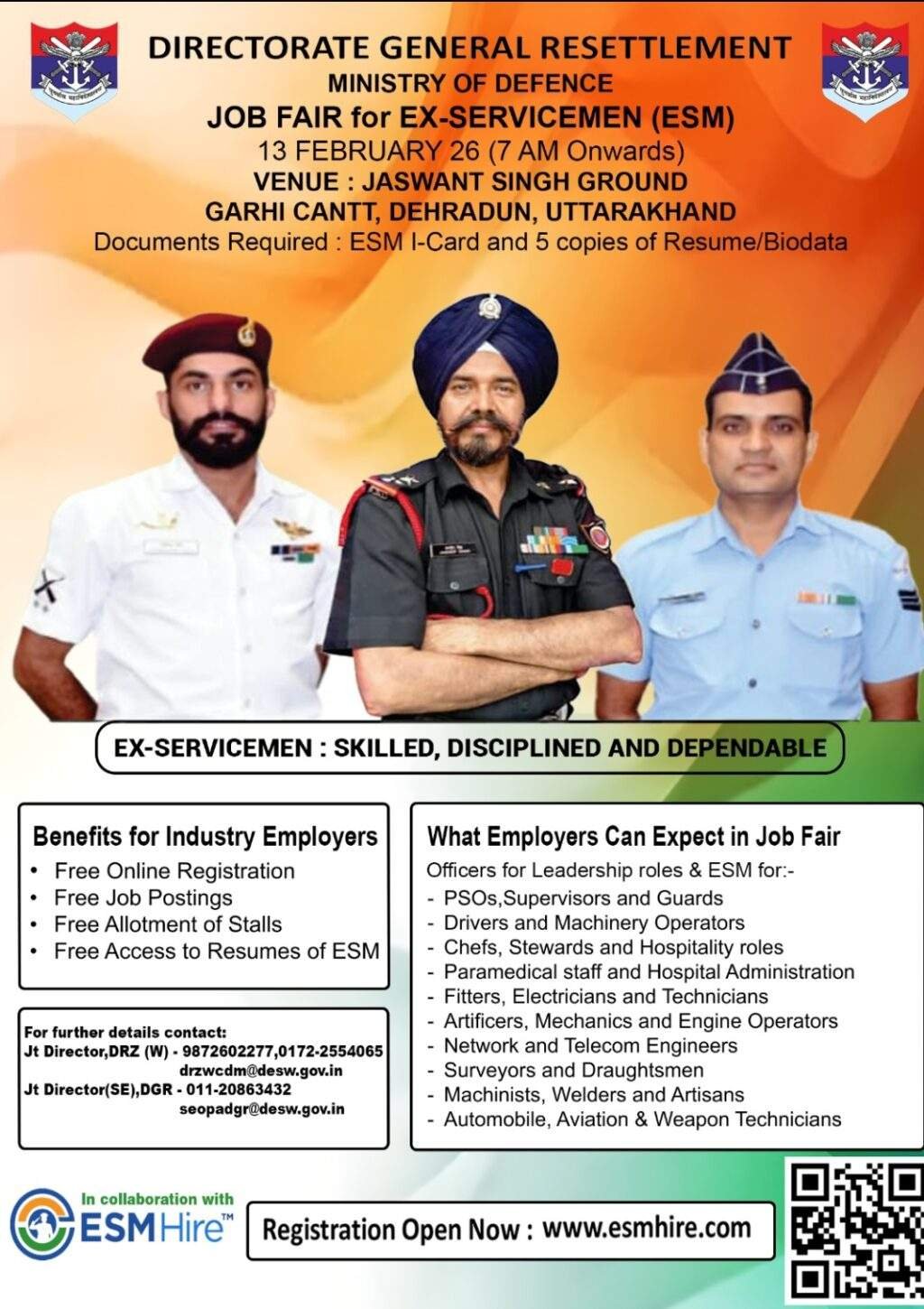 पूर्व सैनिकों को सशक्त बनाने एवं उन्हें नागरिक क्षेत्र में रोजगार उपलब्ध कराने के उद्देश्य से, पूर्व सैनिक कल्याण विभाग (रक्षा मंत्रालय) के अंतर्गत महानिदेशालय पुनर्वास (डीजीआर) द्वारा 13 फरवरी 2026 को प्रातः 7:00 बजे से जसवंत सिंह ग्राउंड, गढ़ी कैंट, देहरादून (उत्तराखंड) में एक विशेष रोजगार मेले का आयोजन किया जाएगा।
