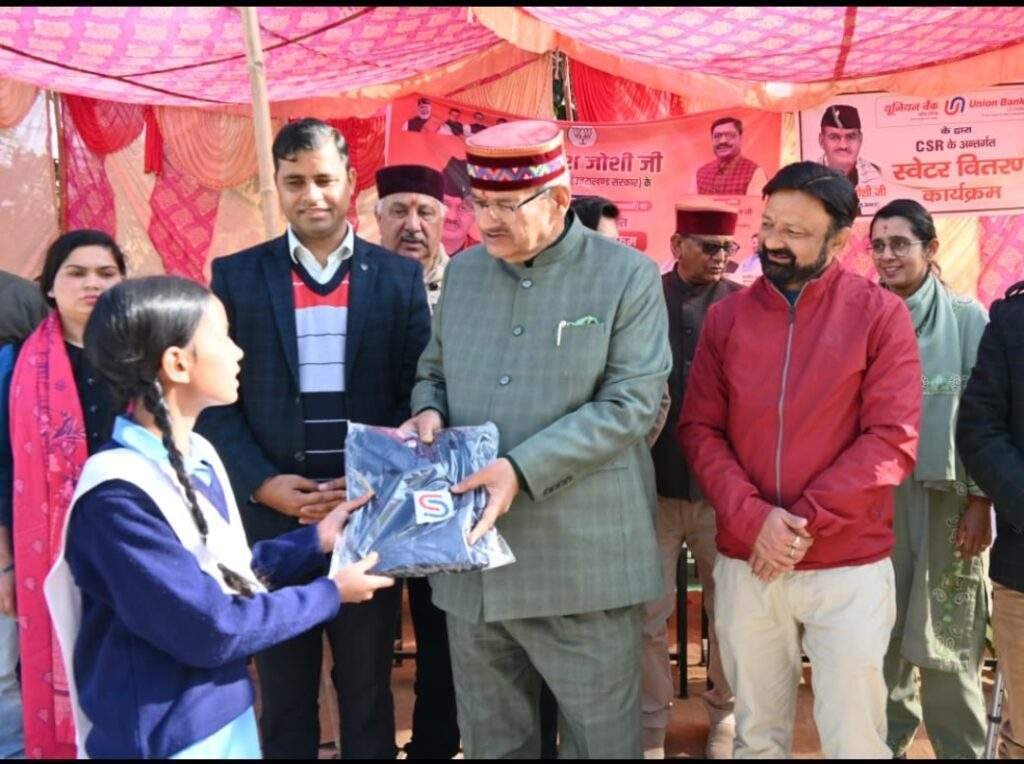 सेवा सप्ताह के अंतर्गत आज राजकीय इंटर कॉलेज किशनपुर के छात्र छात्राओं को गर्म स्वेटर एवं खेल सामग्री की किट वितरित करते कैबिनेट मंत्री गणेश जोशी